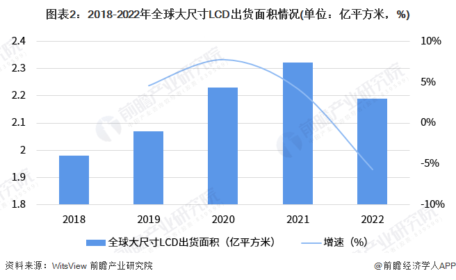 根据WitsView 披露的信息,2018-2022年全球大尺寸LCD出货面积整体呈现增长的趋势,2022年全球大尺寸LCD面板出货面积为2.19亿平方米,同比下降5.7%。