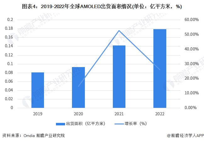 根据Omdia披露的信息,2019-2022年,全球AMOLED出货面积呈现逐年增长趋势,2022年出货面积为0.179亿平方米,同比增长26.06%。
