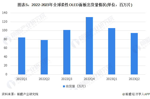 从柔性OLED面板出货量来看,2022年第四季度最多,为130.5百万片;2022全年全球柔性OLED面板出货量为394.2百万片,2023年前两季度全球柔性OLED面板出货量为200.3百万片。