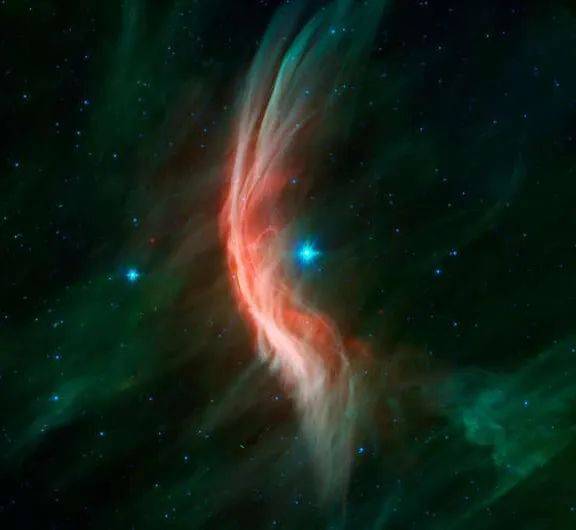 一颗高速飞行的逃逸恒星。它的高速运动导致前方的星际尘埃云中出现了一道弓形激波。NASA / JPL-Caltech