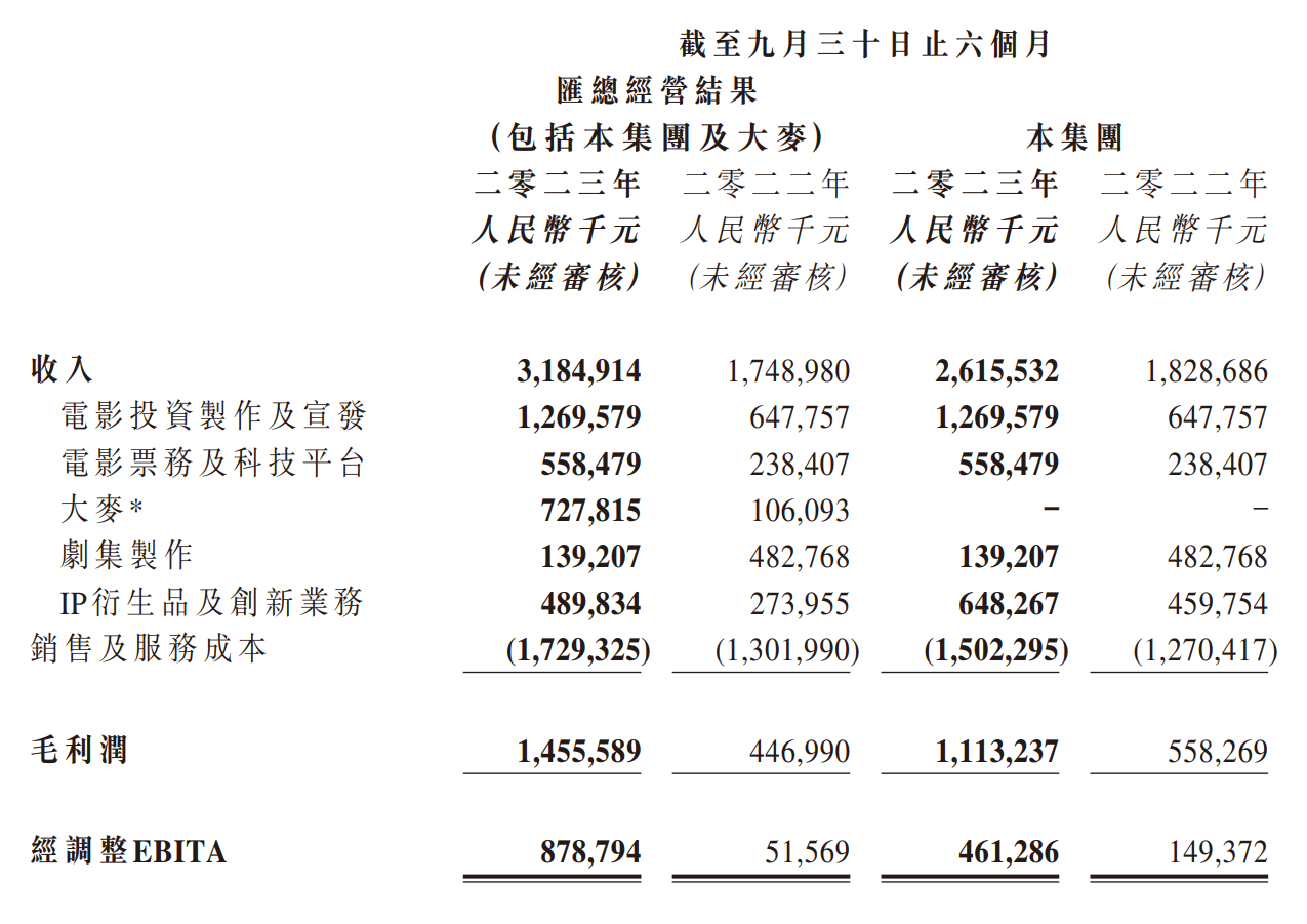 截至2023年9月30日的六个月内,阿里影业实现收入26.16亿元(人民币,下同),同比增长43%;包含大麦的营收为31.85亿元。经调整EBITA盈利约4.61亿元,同比增幅209%,净利润4.64亿元,实现扭亏为盈,去年同期亏损0.22亿元。