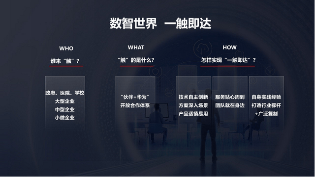 这次品牌动作,也诠释了华为的战略思路。华为中国政企CMO邱恒解释,一触即达的“触”,可以理解成按下一个按纽,即选择了“伙伴+华为”的开放合作体系,让客户“即达”数智世界。而这背后涉及技术的自主创新、深入场景的方案、产品的适销易用,结合在身边贴心周到的服务团队,以及自身转型实践经验+行业标杆经验的广泛复制等等。
