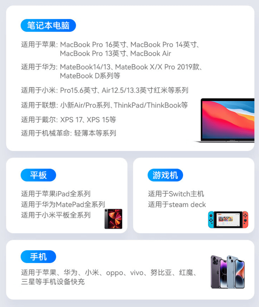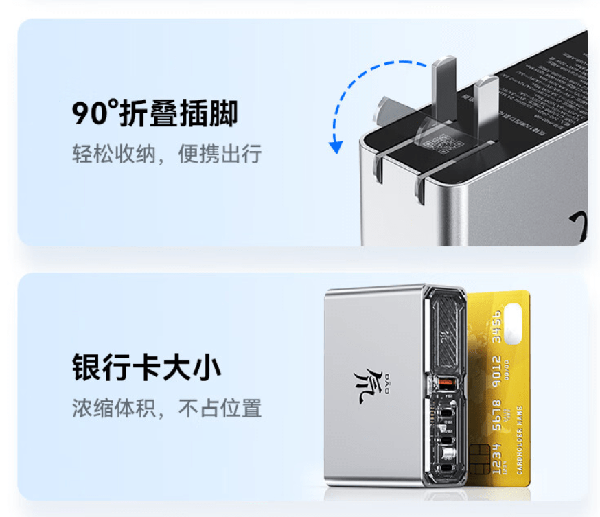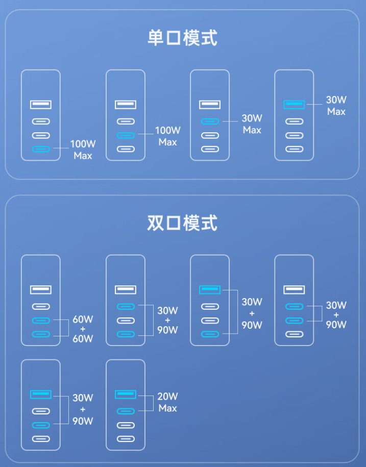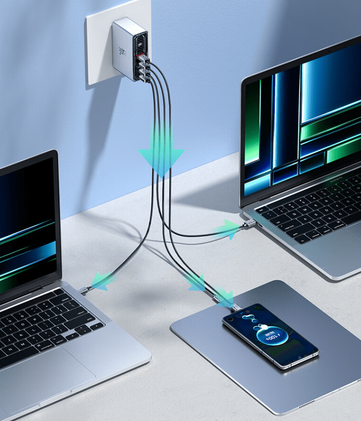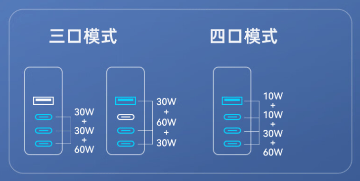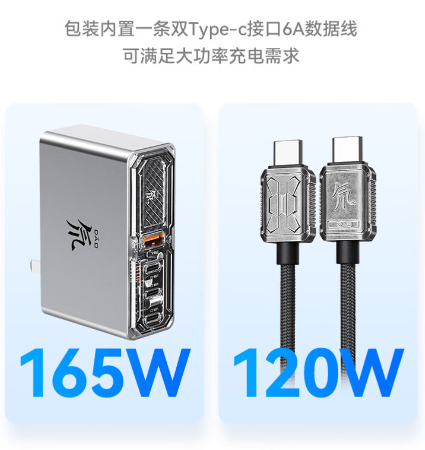该充电器采用三个 Type-C 口和一个 USB-A 口设计,C 口功率可达 100W,双口或三口可达 120W,可实现两台笔记本同时快充。