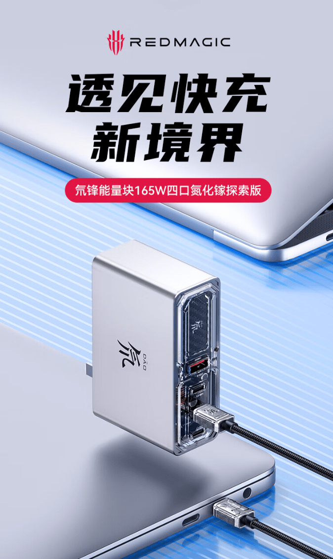 IT之家 11 月 15 日消息,努比亚上架了一款红魔 165W 四口氮化镓透明探索版充电器,商品页标价 349 元,现已开启预约。
