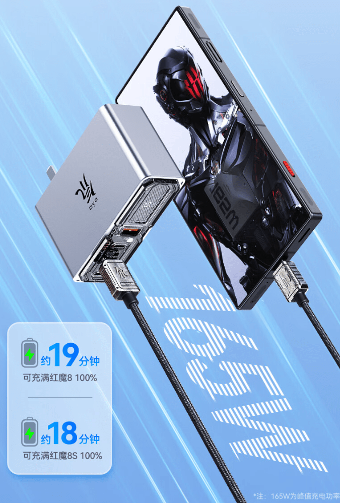 该充电器采用红魔家族式氘锋透明设计,可以看到内部结构;搭载第五代氮化镓技术,号称发热量降低 17%,能耗降低 20%,响应速度提升 19%,支持红魔手机 165W 快充。