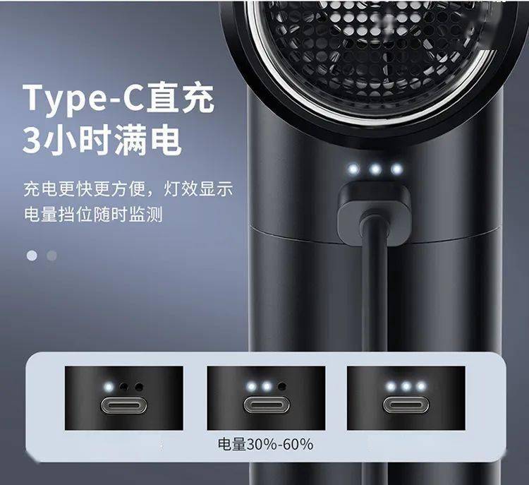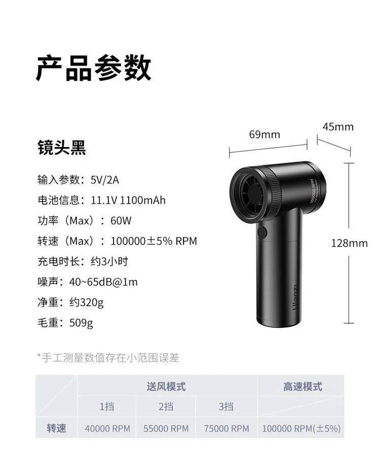 该产品重量约 320g,采用最高 10 万转的直流电机 + 涡轮式扇叶,可调四档风速。