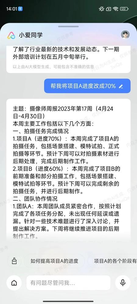 在使用过程中,只需要对小爱同学进行简单的几句指令,它便能快速的生成相关内容,比如,让它写一段简单日报、周报,他可以根据指令中特定的职业,详尽的进行描述一周工作内容的梳理,输出后的内容如果存在问题,还可以继续通过语音进行修正,从而调整部分内容细节,极大程度提升了使用效率。