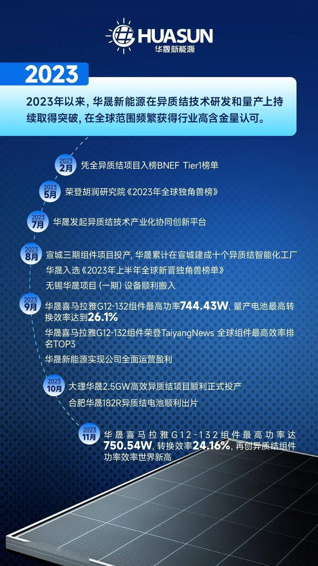 华晟新能源董事长徐晓华表示,2023年,华晟在推进异质结产业化和商业化的道路上阔步前行,成长为行业认可的独角兽。华晟不仅在海内外订单收获颇丰,实现业绩稳步增长,9月份实现全公司运营盈利,异质结在华晟实现了产业化和商业化的成功。华晟还创造了750.54W的异质结组件全球效率纪录。到今年年底,华晟将拥有近20GW异质结产能。无论是技术创新、产能规模还是出货量及市占率,华晟已快速发展成为全球异质结领域的领军企业。