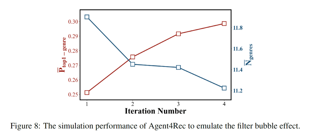 作者还进一步探究了推荐系统中信息茧房问题。作者不断将 agent 选择的物品作为正样本加入训练集,训练新的推荐算法并收集 agent 反馈。随着模拟与重新训练的轮数增多,推荐系统对个体用户推荐的第一大类电影的比例逐渐上升,且推荐系统对个体用户推荐的平均电影种类数下降。这一现象表明,用户接受的信息种类将在推荐算法的干预下越来越单一。