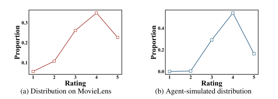 在验证了 agent 的电影喜好合理性的基础上,1000 个 agent 被投放到逐页推荐场景下,agent 可以选择提前退出推荐系统,或在达到 5 页之后强制退出,同时 Agent 对选择观看的电影进行 1 到 5 分的评分。下图实验结果表明 agent 的评分与真实数据中的用户评分呈现分布一致性。