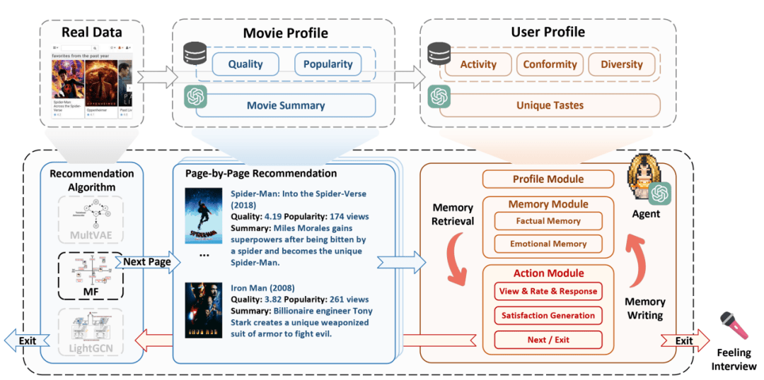 推荐系统将采取逐页推荐的方式,根据特定的推荐算法向用户推荐电影列表。仿照真实的手机 APP 推荐场景,每页将展示 4 部电影。每部电影的信息包括电影名、历史评分、电影简介等。每个 agent 将根据自身的电影喜好、疲惫程度以及个人记忆对推荐的电影做出反应,如观看或评价电影。同时,历史推荐内容和 agent 行为将被存储在记忆中,agent 通过 reflection 的方式总结对推荐系统的满意度和自身的疲惫程度。Agent 在每一页推荐结束后,都根据自身满意度和疲倦度,选择翻到下一页或者退出推荐系统。在用户退出系统之后,采访用户退出推荐系统的原因和对推荐电影的评价。