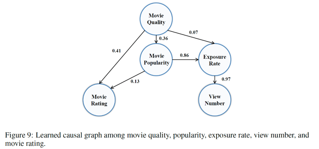 首先,作者利用 Agent4Rec 平台收集多维度推荐数据,探究推荐系统中潜在的因果关系。作者选取 5 个推荐系统中常见的变量:电影质量、电影流行度、电影曝光率、电影浏览量、电影评分,通过 DirectLiNGAM 建模一个带权有向无环因果图,分析这 5 个变量间的因果关系。下述因果图的左半部分说明,电影评分只受电影质量与电影流行度的正向影响。因果图的右半部分说明电影的质量和流行度将共同影响电影的曝光率,进而影响电影被点击次数。这反映了推荐系统中的的流行度偏差效应:更流行的物品被更多曝光,进一步导致物品流行度环路放大效应。