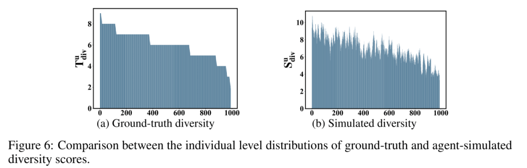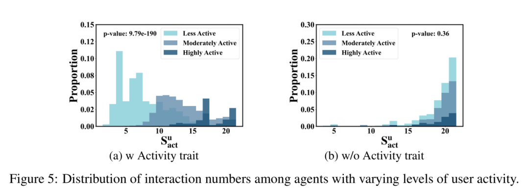 作者还通过消融实验研究了不同特质初始化对 agent 行为起到的作用。下述实验结果表明,没有个性化的特质初始化,agent 的行为呈现趋同,与现实生活中的真实用户行为长尾分布有别。