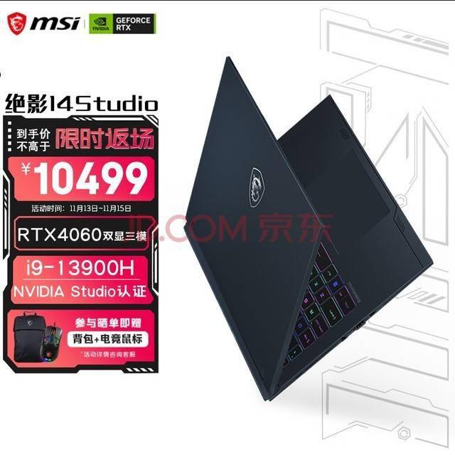 目前,这款轻薄游戏本正在返场折扣活动中,售价新低仅为10499元。消费者可通过京东商城购买微星绝影14 Studio游戏本享受优惠价格。