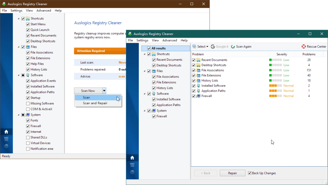 软件启动后,从左侧窗格列表中可以选择包括快捷方式、文件、软件、系统等4类优化项目,每类下又分列多个子项目可供选择。选择所需扫描的项目后,在右侧选择Scan进行扫描,或选择Scan and Repair扫描并修复。如果选择前者,扫描结束后,点击Repair按钮进行手动修复。若选中了Back Up Change选项,则会将改变前的注册表保存为备份,需要时可执行反悔操作。