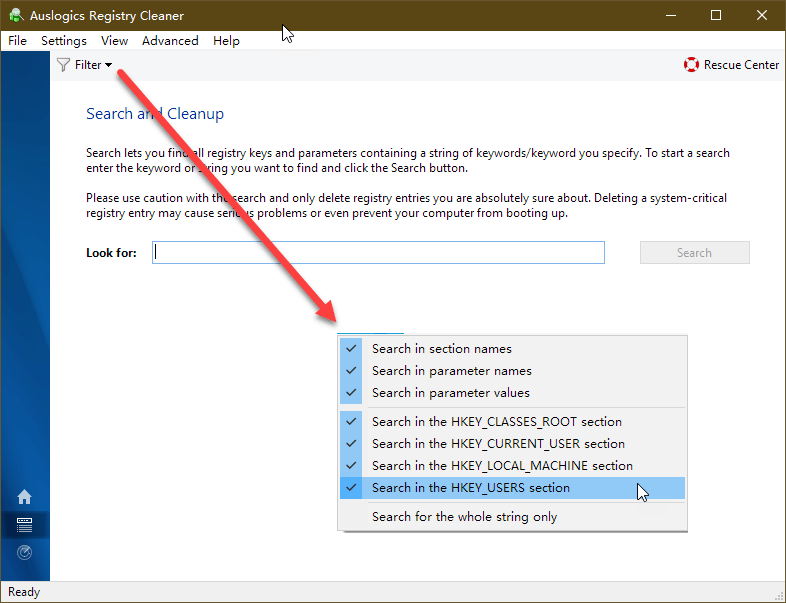 在需要对特定注册表项进行筛选清理时,可点击左侧栏的第二个按钮,然后在Look for框中输入注册表键值关键词进行搜索。在上方的Filter菜单中,还可以选定搜索的范围。