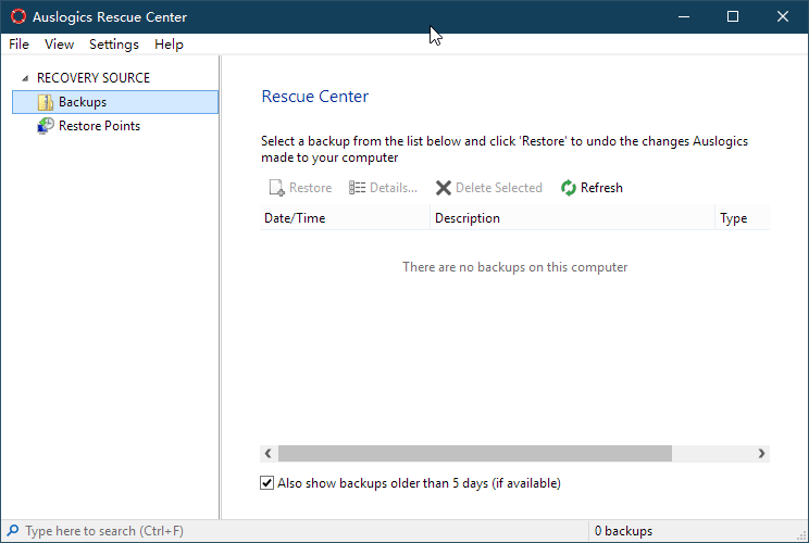 如果清理不当出现问题,可点击Rescue Center进入软件安全中心窗口,在Backups一栏下选择先前备份的数据进行注册表还原;或在Restore Points一栏下,选择系统还原点进行系统还原。