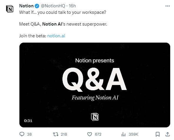 🚀 功能介绍: Notion推出AI搜索功能Q&A,用户可通过提问AI获取信息,企业可集中信息并通过AI提供答案,无额外开发成本。
