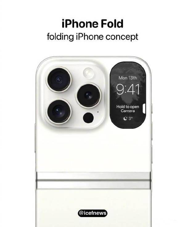 从网传的图片可以发现,iPhone Fold主要是基于最新的iPhone 15 Pro系列进行的设计,其采用了小折叠屏的设计理念,看上去是将iPhone 15 Pro Max中间进行了折叠改造,从而能够实现上下折叠。此外,小折叠屏手机上常见的副屏也出现在了iPhone Fold上,其位于背部相机模组的右侧,不过由于镜头模组面积较大,看上去副屏的显示面积非常有限,主要用于显示时间、天气等信息。手机在展开后,屏幕正面基本就与iPhone 15 Pro Max保持一致,同样拥有灵动岛设计,而且概念图中屏幕的折痕非常浅,几乎不可见。