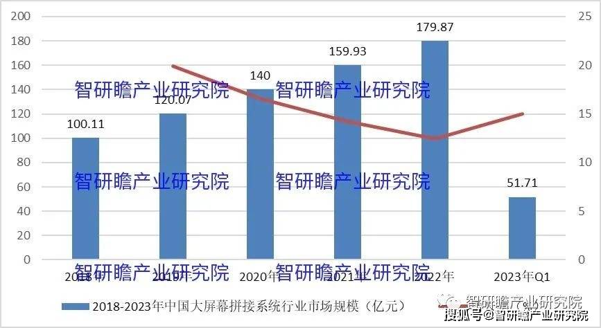 统计数据显示,2018年中国大屏幕拼接系统行业市场规模100.11亿元,2022年中国大屏幕拼接系统行业市场规模179.87亿元,同比增长12.47 %。2018-2023年中国大屏幕拼接系统行业市场规模如下: