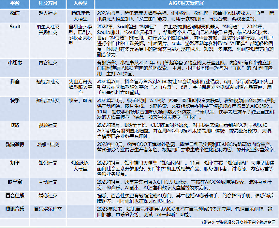 梳理可见,表达、信息交换等方式更新已推动产品变化。目前,Soul推出“AI绘画”、“Soul次元歌手”和聊天机器人“AI苟蛋”;快手在短视频评论区提供互动问答、图片生成等服务;小红书上线“Trik ”主打AI绘画;字节跳动对外测试AI对话产品豆包;百合佳缘、腾讯音乐等平台探索情感倾诉、AI一起听等新玩法。