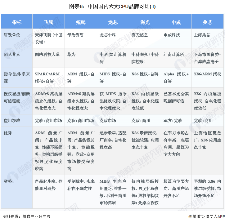 目前国产电脑服务器CPU品牌主要有六个,分别是飞腾、鲲鹏、龙芯、海光、申威和兆芯,六大品牌各有各自的发展优势和路径,具体情况如下: