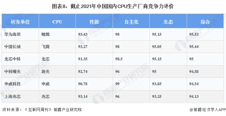 而根据2021年《互联网周刊》出具的信创行业CPU芯片排行来看,目前国内电脑服务器用CPU生产厂商中,按产品性能分华为海思的鲲鹏以93.43的评分高居榜首,按产品自主化分申威科技以99的评分居于榜首,按CPU生态划分华为海思的鲲鹏和龙芯中科的龙芯评分均为95,并列第一。综合来看,华为海思的鲲鹏CPU以95.53的评分排名第一,中国长城名下的飞腾芯片则以95.44的评分位列第二。