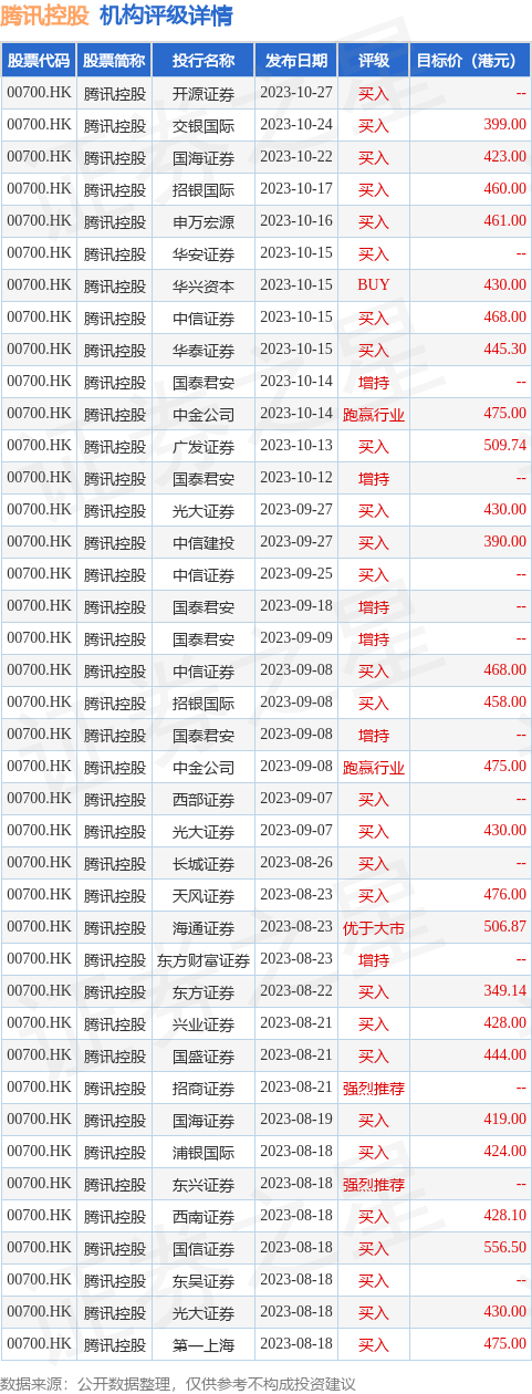 截至2023年11月15日收盘,腾讯控股(00700.HK)报收于322.6港元,上涨4.81%,换手率0.34%,成交量3245.47万股,成交额103.51亿港元。投行对该股的评级以买入为主,近90天内共有28家投行给出买入评级,近90天的目标均价为448.41港元。开源证券最新一份研报给予腾讯控股买入评级。