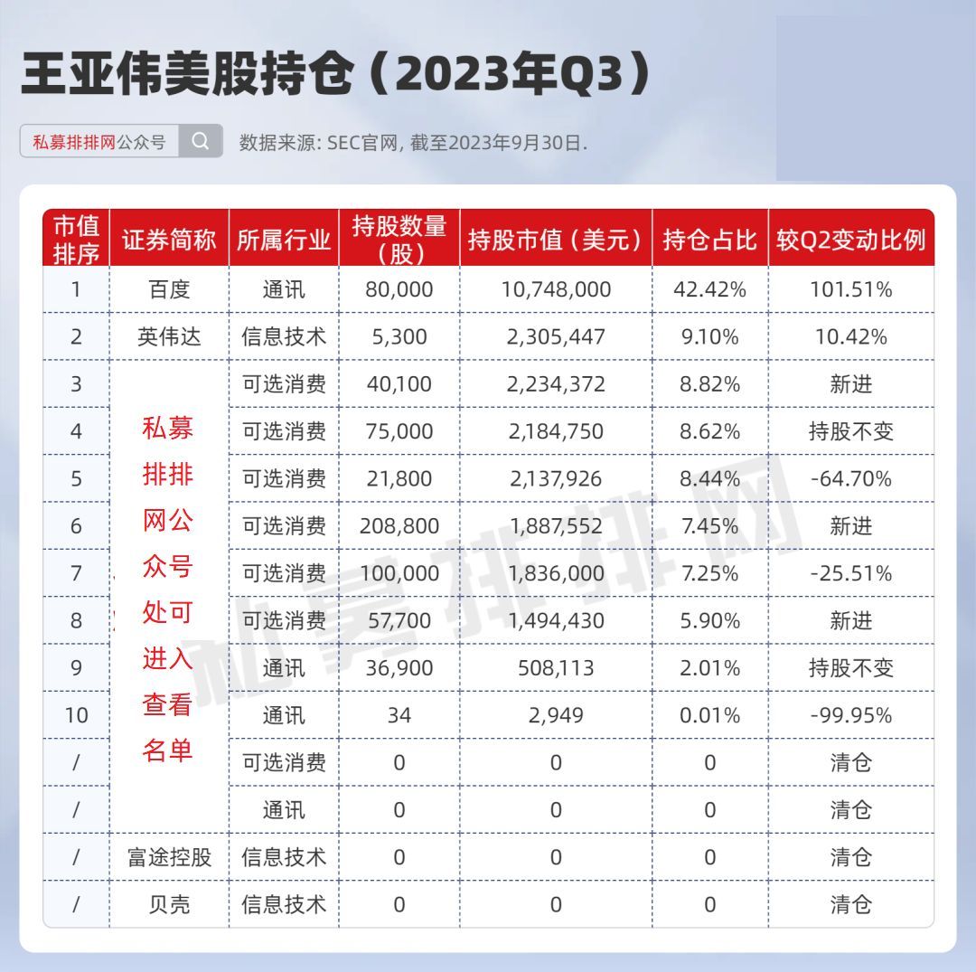 整体来看,三季度王亚伟的美股持仓维持了今年以来以中概股为主的布局,侧重于互联网消费和通信领域——与景林资产、高毅资产等中国私募龙头的方向类似。