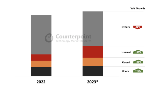 【手机中国新闻】11月16日,手机中国了解到,根据Counterpoint Research最新一期的智能手机360周报,中国智能手机市场正在呈现出复苏迹象,10月的前四周平均同比增长了11%。Counterpoint指出,华为成为最耀眼的品牌,在这一时期占据了整体市场大部分的净增份额。分析师Archie Zhang表示,随着搭载新麒麟芯片的华为新品推出,华为是十月表现最亮眼的品牌,其Mate 60系列的成功使其逆势崛起。