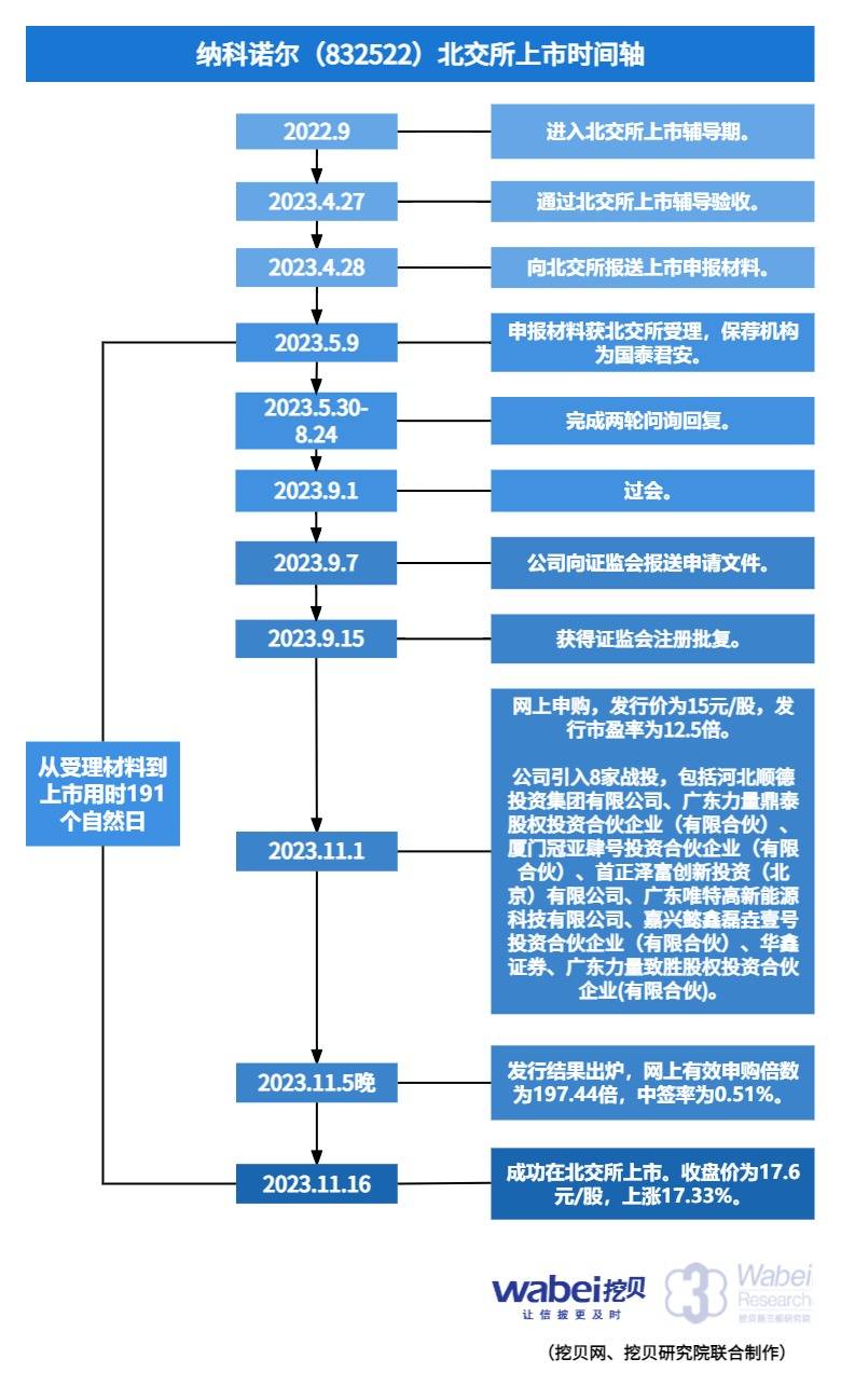 2023年5月30日至8月24日,公司完成两轮问询回复,2023年9月1日过会,9月15日获得证监会注册批复,11月16日在北交所上市。从申报材料获受理到上市用时191天。