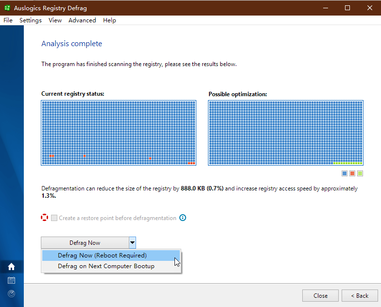 注册表碎片整理的方式,可选择整理后立即重启,或选择下次启动系统时进行自动整理。