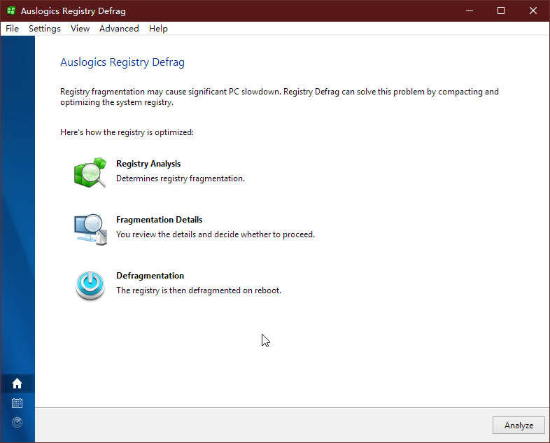 启动软件后,默认显示注册表碎片整理优化界面,点击右下角的Analyze按钮,开始分析。注册表碎片整理分三个阶段进行,第一阶段(Registry Analysis)为分析并确定碎片,第二阶段(Fragmentation Details)显示具体情况,第三阶段(Defragmentation)进行碎片整理。