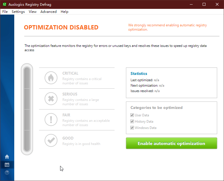 如果要对注册表进行压缩优化,点击窗口左侧的第二个按钮或“View→Registry Optimization”菜单命令进行。该功能监视注册表中的错误或未使用的项,并对发现的问题加以解决。点击Enable automatic Optimization绿色按钮,可启动注册表自动优化功能。