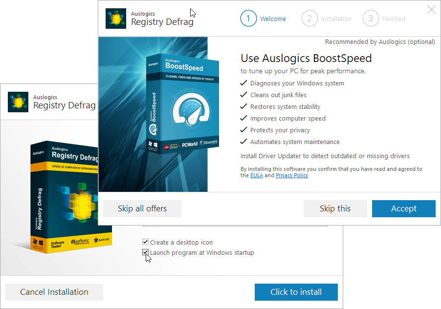 在Windows中整理注册表碎片和压缩优化注册表,单靠手动的办法难以进行。我们可以使用一款免费软件Auslogics Registry Defrag来完成上述任务。为了方便使用,在安装过程中选择Create a desktop icon选项在桌面建立程序的快捷方式图标,选择Launch program at Windows startup选项以保证程序随系统自动启动。另外需要特别注意,软件安装过程中会有两个相关的系统优化共享软件推广选项,若不需要这些,可点击Skip all offers跳过安装。