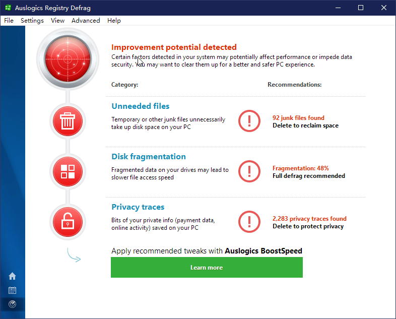 如果要解决系统这些问题,可安装另一款软件Auslogics Boostspeed来处理。