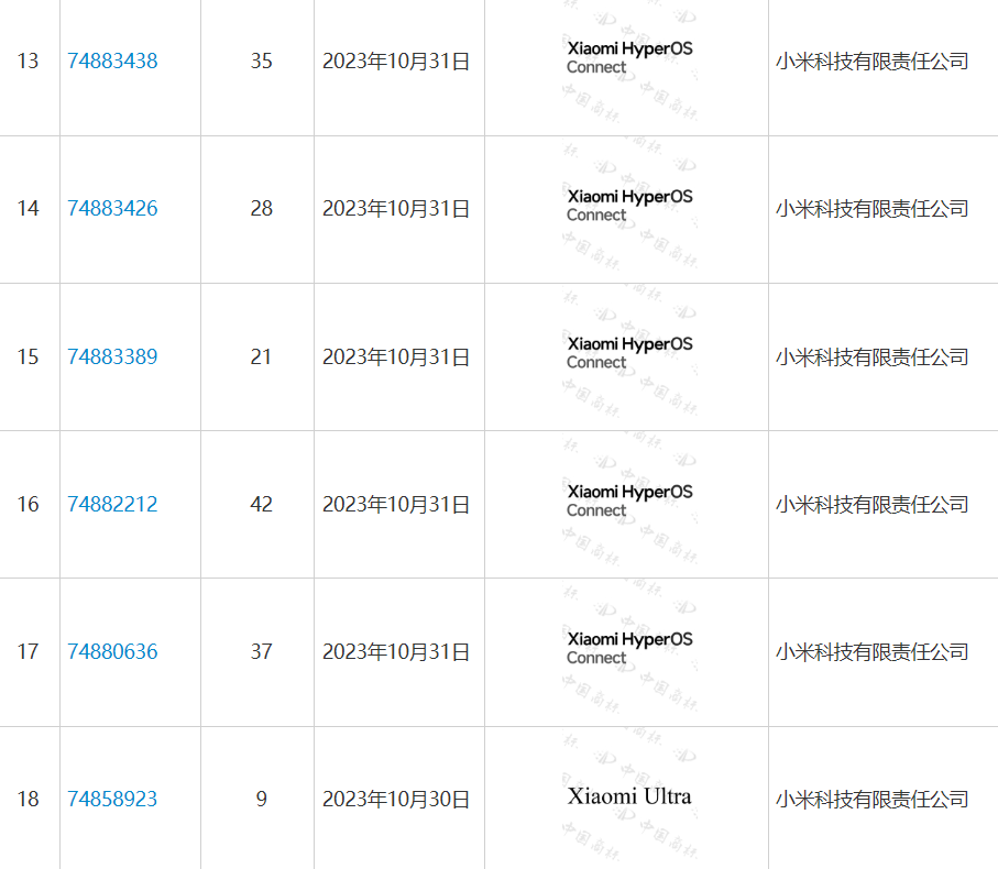申请页面显示,XIAOMI HYPEROS CONNECT 的国际分类涵盖设计研究、广告销售、科学仪器、健身器材、通讯服务、厨房洁具、运输贮藏、灯具空调等,可以说涉及到大家生活的方方面面,当前商标状态均为注册申请中。