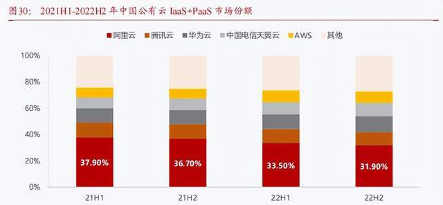 据IDC数据,截至2023年上半年,阿里云在中国公有云IaaS市场中排名第一,市场份额达29.9%,远超过华为云的13.2%和天翼云的12.2%;在PaaS领域,阿里云亦凭借27.9%的份额占比领跑市场。IaaS、PaaS、SaaS是云计算的三种主要类型,随着越来越多的企业迁移到云中,它们都在普及。在今年10月召开的2023云栖大会上,新任阿里巴巴集团董事会主席蔡崇信表示,目前中国80%的科技企业和超过一半的大模型公司都跑在阿里云上。