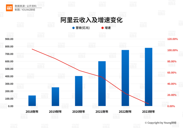 但阿里云并非稳坐钓鱼台。一方面,随着腾讯云、华为云等友商持续追赶,以及三大运营商的云计算业务快速崛起,阿里云市场份额正在被不断挤压;另一方面,随着中国互联网行业流量见顶和IaaS市场逐步饱和,近几年阿里云的收入增速不断放缓:从2018财年的101%大幅下降至2023财年的3.53%,其中2023财年Q4甚至出现了负增长。