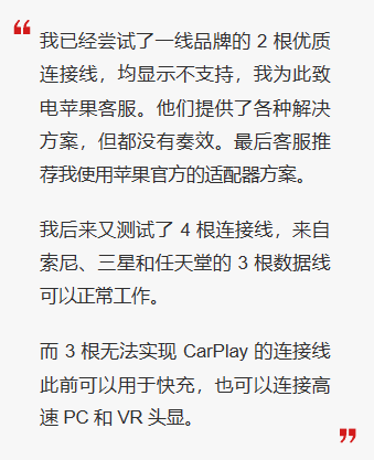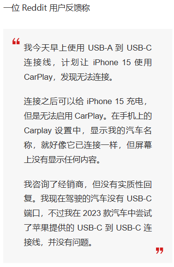 不过,这次换了 USB-C 接口后,很多网友抱怨自己的 iPhone 无法使用 CarPlay 了。