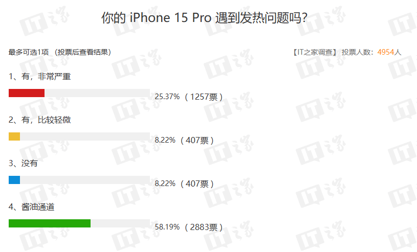 根据我们IT之家的读者投票显示,大约有三成用户表示 iPhone 15 Pro 系列的确存在发热问题,只不过有的网友觉得严重,有的网友觉得不严重。
