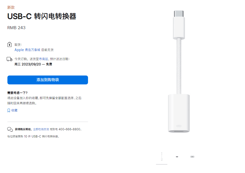 苹果官方提供的解决方案是购买“USB-C 转闪电转换器”,目前国内售价为 243 元。