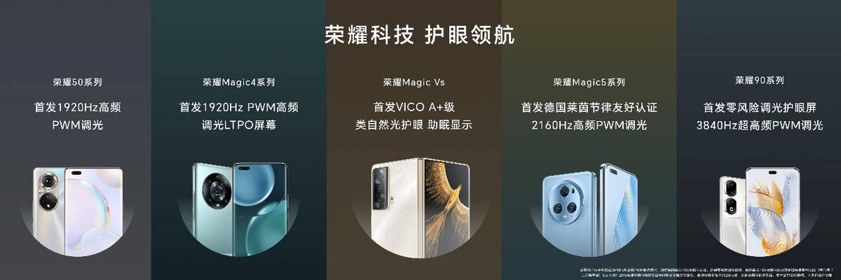 荣耀50系列首发1920Hz高频PWM调光,荣耀Magic Vs成为首款获得中标院VICO A+舒适认证的手机,支持类自然光护眼及助眠显示;荣耀90系列全球首发零风险调光护眼屏,支持 3840Hz 的超高频 PWM 调光,通过德国莱茵TÜV无频闪认证;此外,荣耀还拥有多项首创护眼技术和100余项护眼专利,以大幅领先的护眼科技,为行业提供高标准护眼范本。