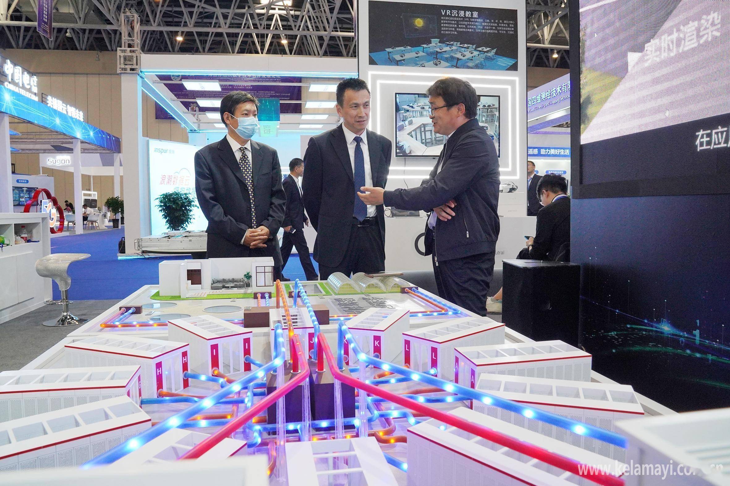 碳和网络科技公司总经理王涛(右一)在中国-上海合作组织数字技术合作发展论坛展会现场与客商交谈。克拉玛依融媒记者 李浩然 摄