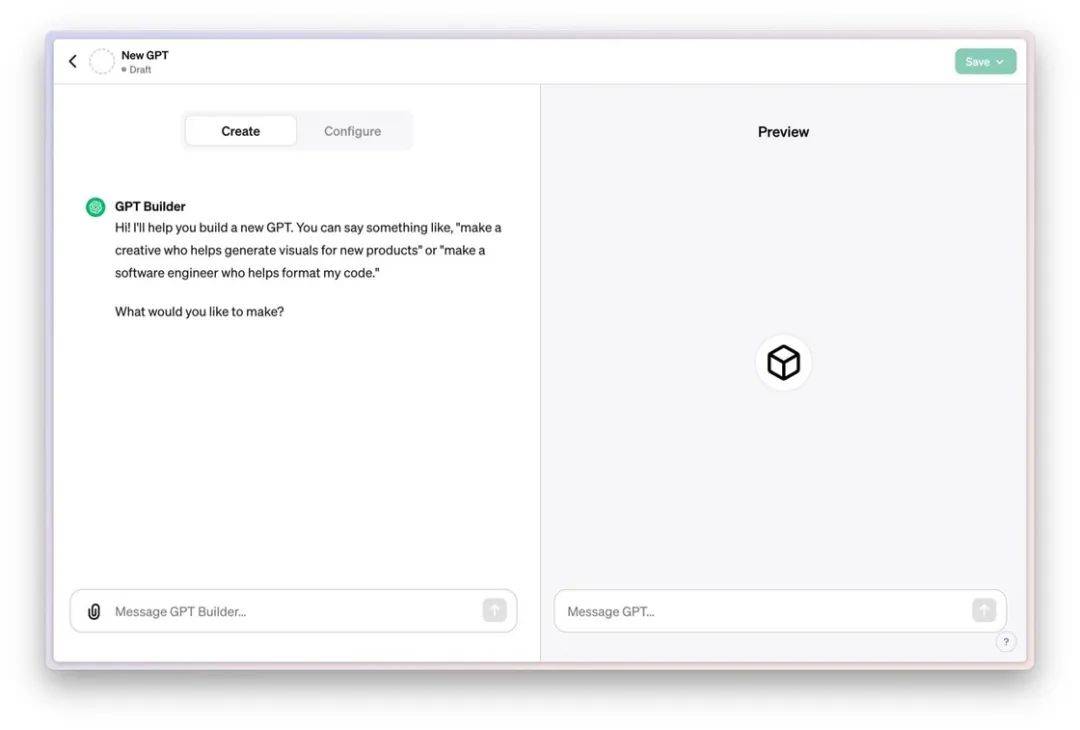 Open AI发布会第二天就上线了GPTs,所有ChatGPT Plus订阅用户都可以通过GPT Builder创建和定制个性化GPT应用。GPT Builder提供的是一个直观易用的界面,用户无需编程知识只需要聊天,或者简易指示图即可进行定制。