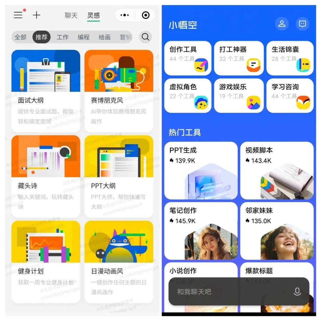 这样针对C端的应用生态打造上,字节系反而显得更为激进一些,其大刀阔斧地对旗下“悟空搜索”进行改革,除更名为“小悟空”外,更直接改变了信息搜索引擎定位,转变为“AI工具库”。启动“小悟空”后可以看到,其块状界面设计更类似应用商城,其顶部为智能工具区,分类包括创作生成、学习提升、工作职场、专业咨询、虚拟角色、休闲娱乐等六个类别,每个类别中显示有其中的工具数量。