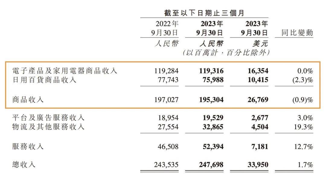相对比下,商品收入在Q1仅增长了0.9%。拆分来看,家用电器和电子产品上的收入1193亿,同比几乎持平;日用百货收入仍未摆脱过去几个季度的萎靡,同比下滑2.3%,录得760亿元,但相比Q1和Q2 8.7%和8.5%的跌幅已经大幅收窄。