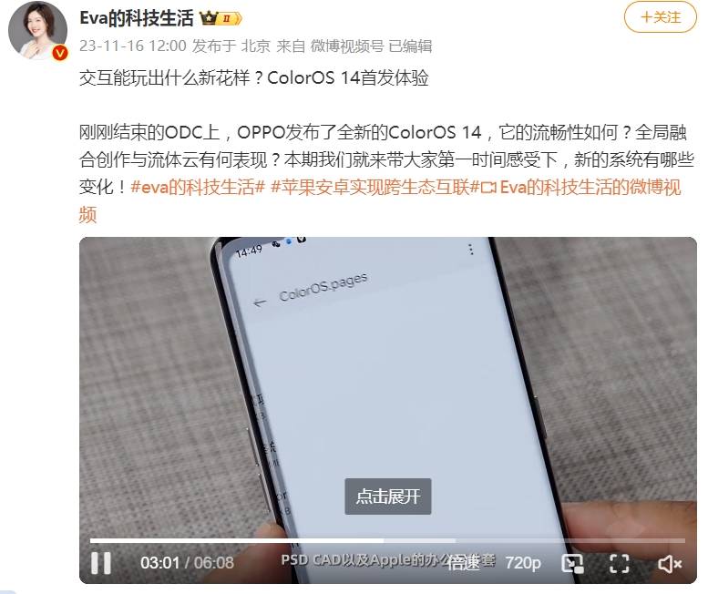 在ColorOS 14中能够带来明显便捷体验提升的不只是随身工作台功能,它全新升级的文件随心开功能也十分好用。知名大V Eva的科技生活上手实测之后,第一时间分享体验心得,特别指出ColorOS 14能直接打开PSD、CAD和Apple办公三件套,基本覆盖了所有系统,日常工作中的所有文件,不需要再考虑是否适配能不能打开的问题,手机端可以一键打开,无需电脑和第三方应用加持,这对于经常移动办公的朋友来说实在贴心。
