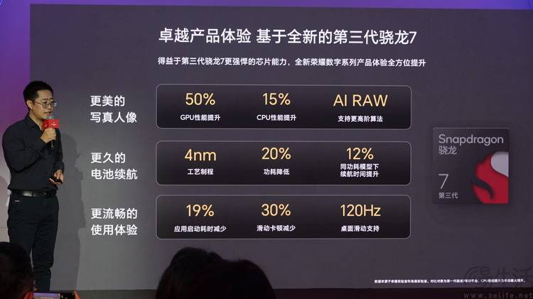 在今天这场发布会的最后,作为合作伙伴的荣耀方面,也早早地公布了第三代骁龙7首发机型的相关信息。