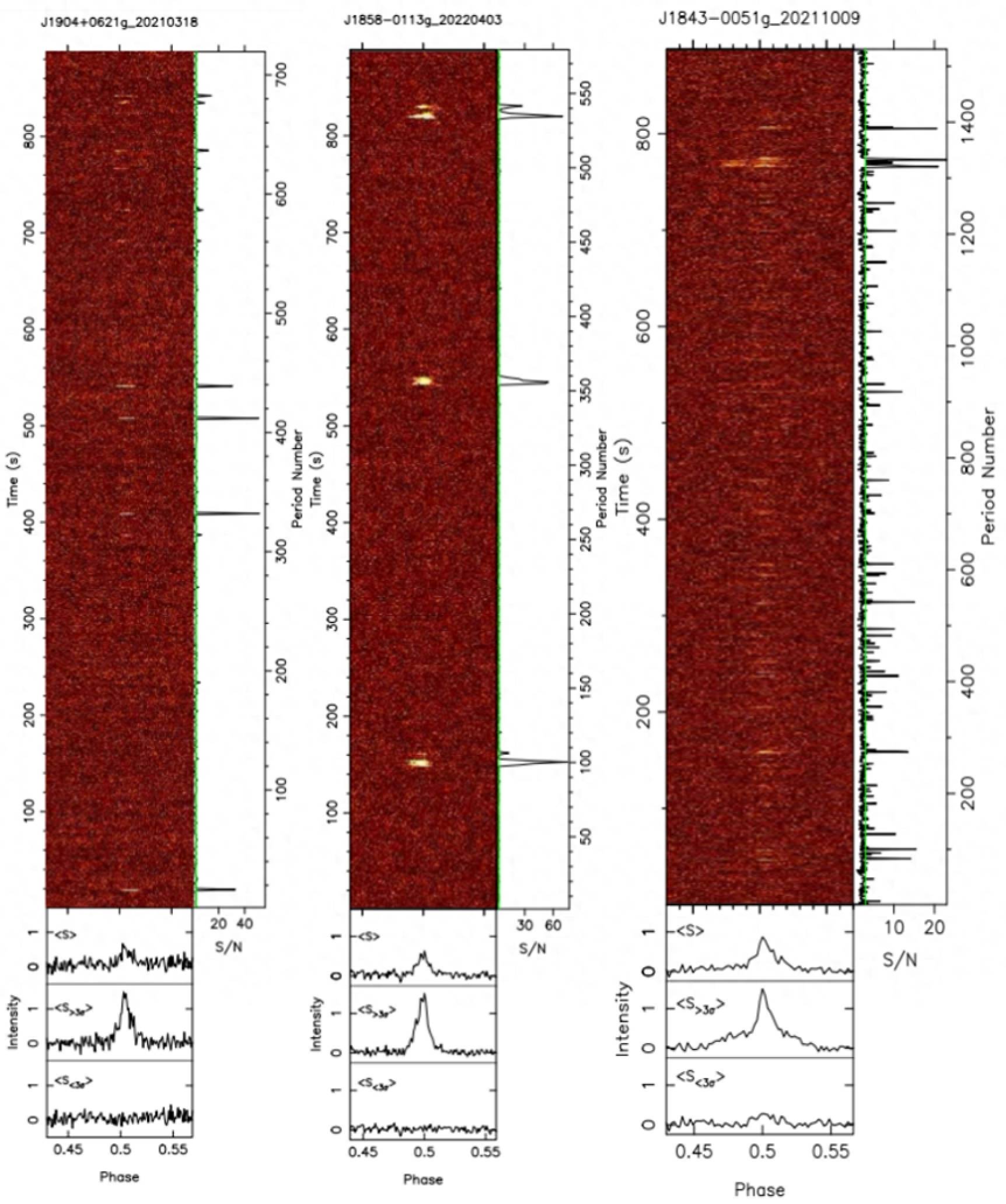 中国天眼新发现的偶发脉冲星(左:经典RRAT;中:极端消零脉冲星;右:偶发强脉冲的暗弱脉冲星)